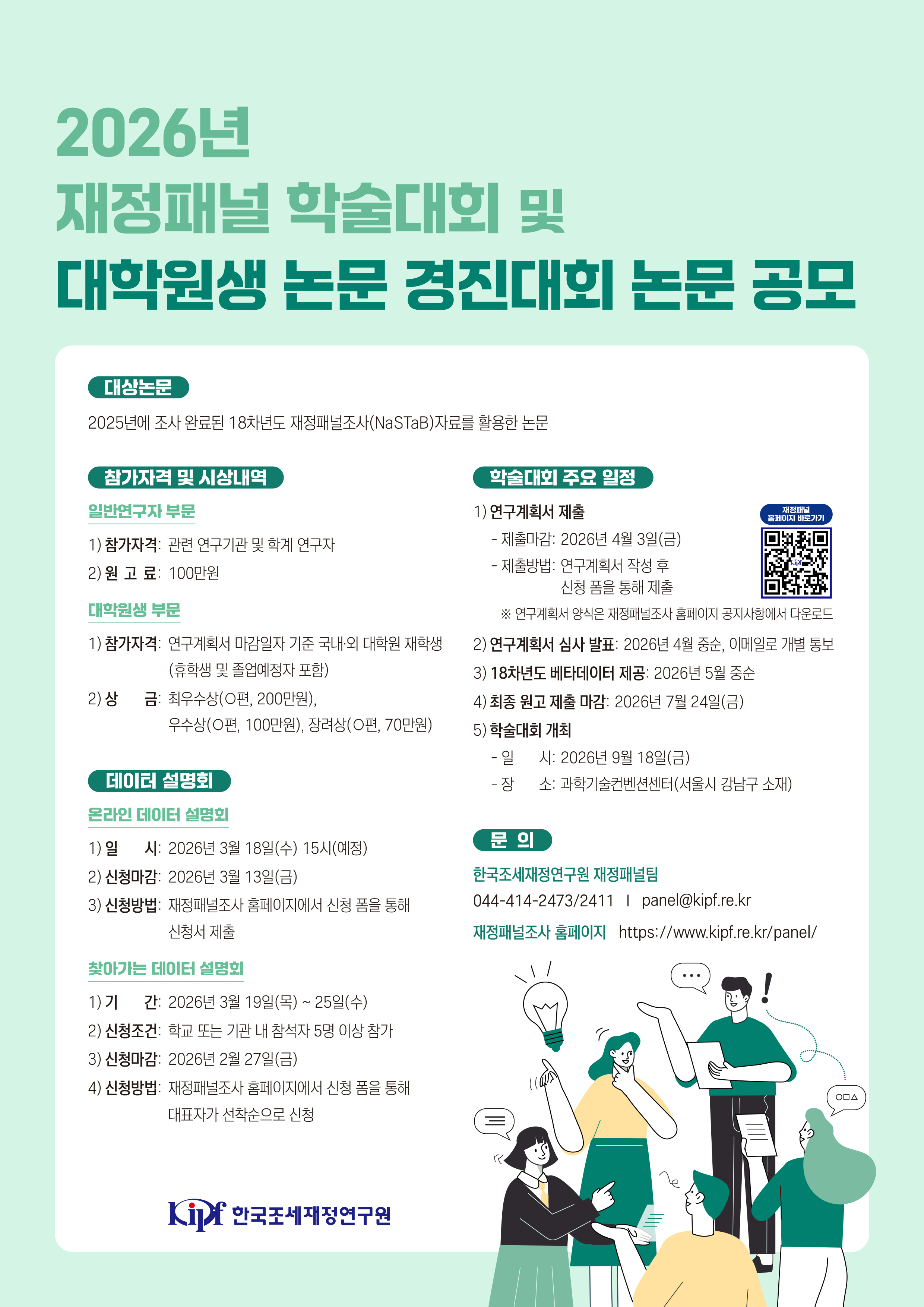 한국조세재정연구원에서는 ‘2026년 재정패널 학술대회 및 대학원생 논문 경진대회’를 개최하고자 우수한 연구논문을 아래와 같이 모집합니다. 관심 있는 연구자 여러분들의 많은 참여 바랍니다.