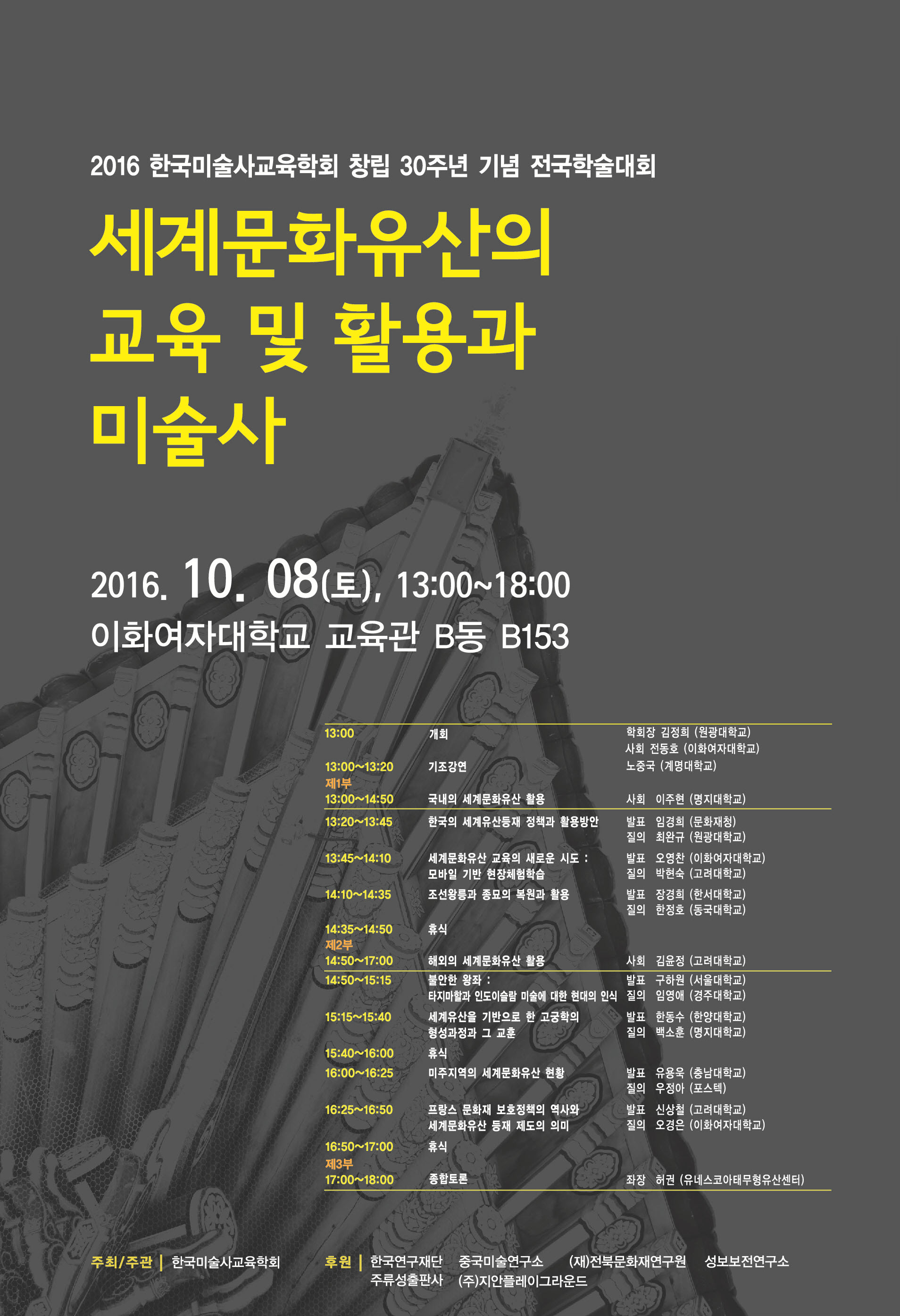 한국미술사교육학회는 학회 창립 30주년을 맞이하여 '세계문화유산의 교육 및 활용과 미술사'라는 주제로 전국학술대회를 개최합니다.