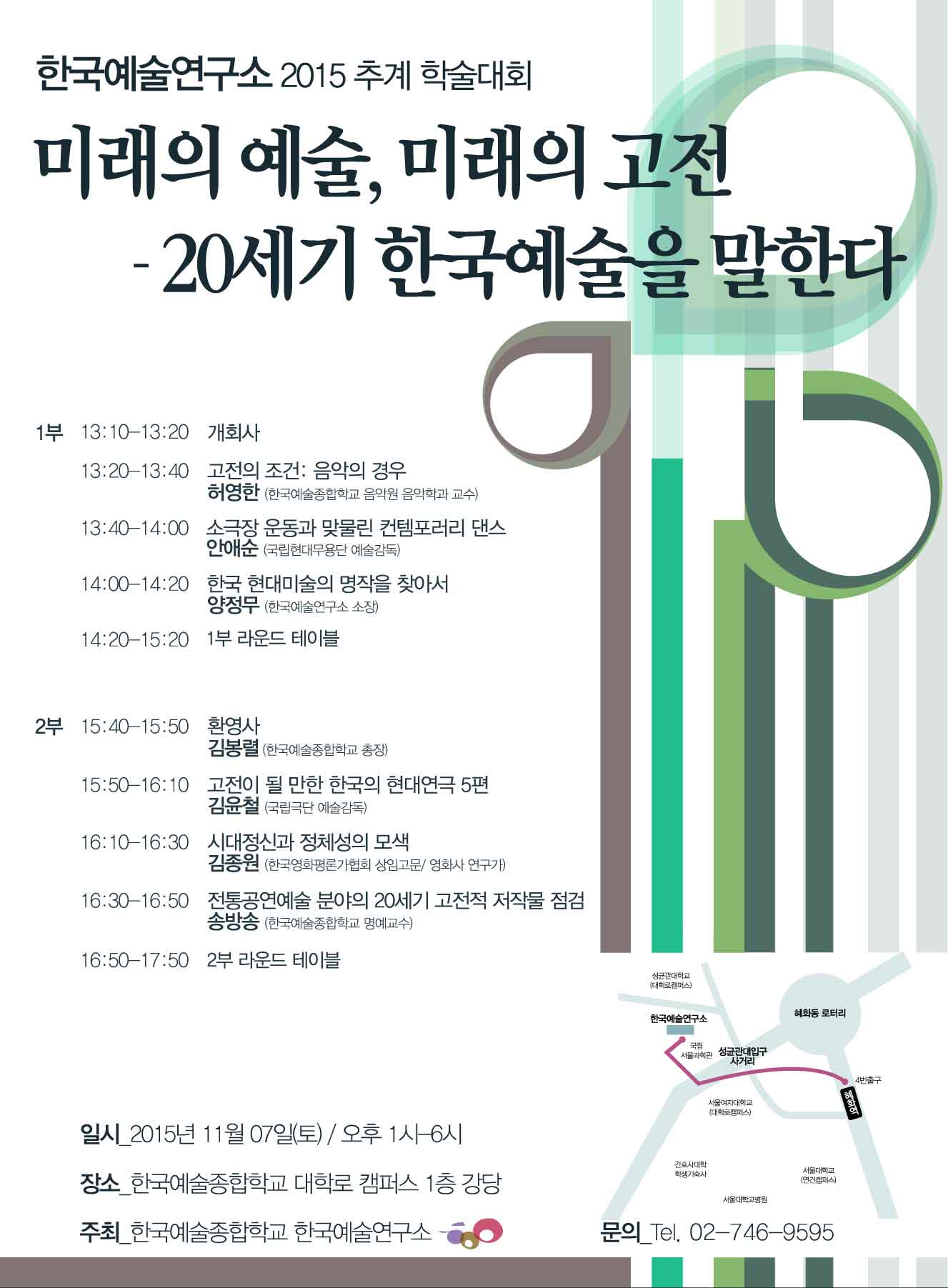 한국예술종합학교 한국예술연구소(소장 양정무)는 11월 7일(토) 오후 1시~6시 대학로 캠퍼스 1층 강당에서 2015년 추계 학술대회 「미래의 예술, 미래의 고전 – 20세기 한국예술을 말한다」를 개최한다.