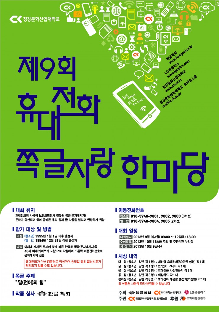 한글학회는 청강문화산업대학교, 엘지유플러스와 함께 제9회 휴대전화 쪽글자랑 한마당 대회를 펼칩니다. 이 대회는 올바른 우리말과 글의 사용을 알리고 권장하기 위해 진행되는 행사로, 청소년과 일반으로 구분하여 진행합니다. 누구나 참여할 수 있는 이번 대회에 많은 관심과 지원을 부탁합니다.- 대회 취지