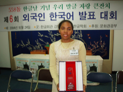 2004년 10월 24일 (일) 오전 10시부터 한글회관 강당에서 있은 '제6회 외국인 한국어 발표 대회'에서 으뜸기림을 받은 크리스타 캄가 님의 모습.