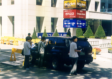 2004년 9월 15일, 강남 중학교 '사회 참여 체험 학습의 날'에 이 학교 3학년 학생들이 거리 간판 조사를 하고 있는 모습. 이 친구들 남의 차에 대고 가게이름을 적고 있군요. 한글학회 이웃지역을 조사하기로 한 7조 친구들 맞지? 병하, 명훈이, 형수, 창만이…