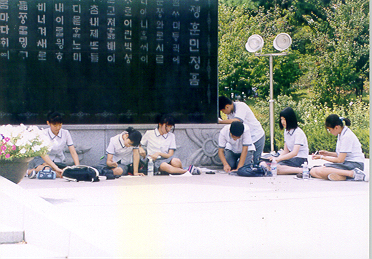 2004년 9월 4일, 여의도에서 있었던 제1회 한글이름 가진 이 글짓기 대회의 한 모습. 참가 학생들이 그늘을 찾아 세종대왕 동상 앞에서 글쓰기에 열중하고 있다.