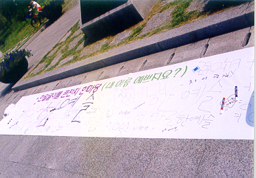 2004년 9월 4일, 여의도에서 있었던 제1회 한글이름 가진 이 글짓기 대회의 한 모습. 이 날 세종대왕 동상 앞 뜰에 긴 현수막을 펼쳐 놓고 이 곳에 자기이름을 뽑내도록 하였는데 '한예슬'이란 이름 너무 뽑낸 거 아냐?