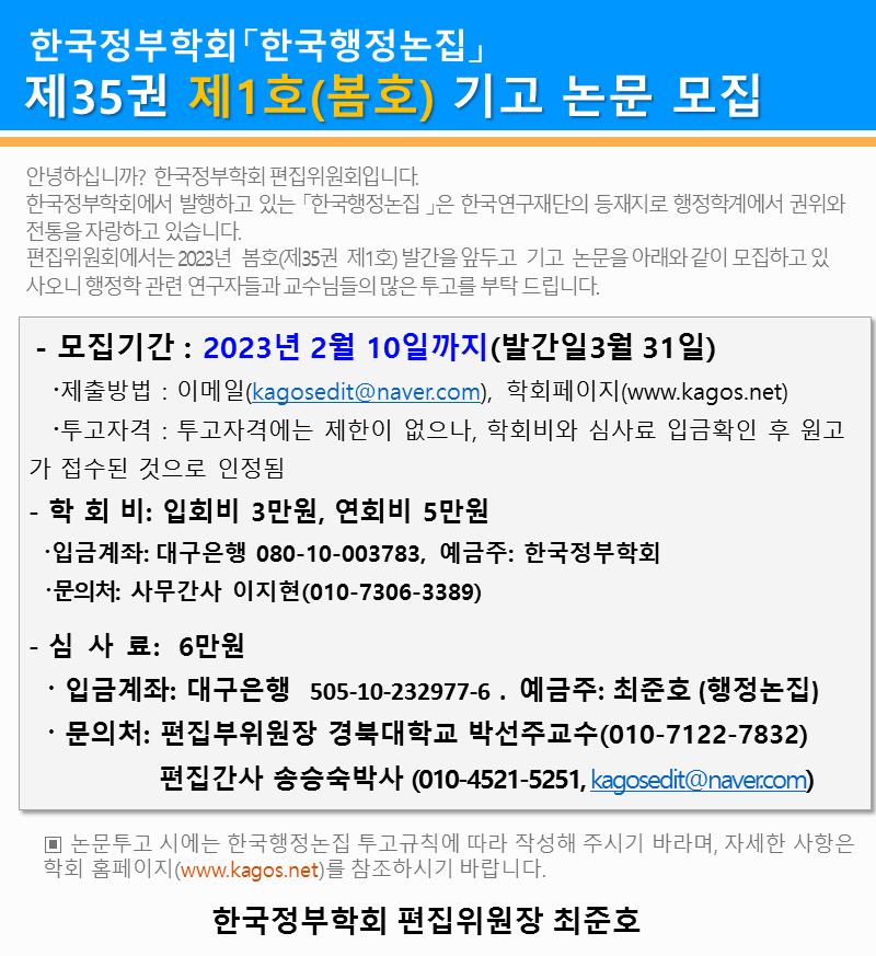 한국행정논집 35권 제1호 논문기고 안내