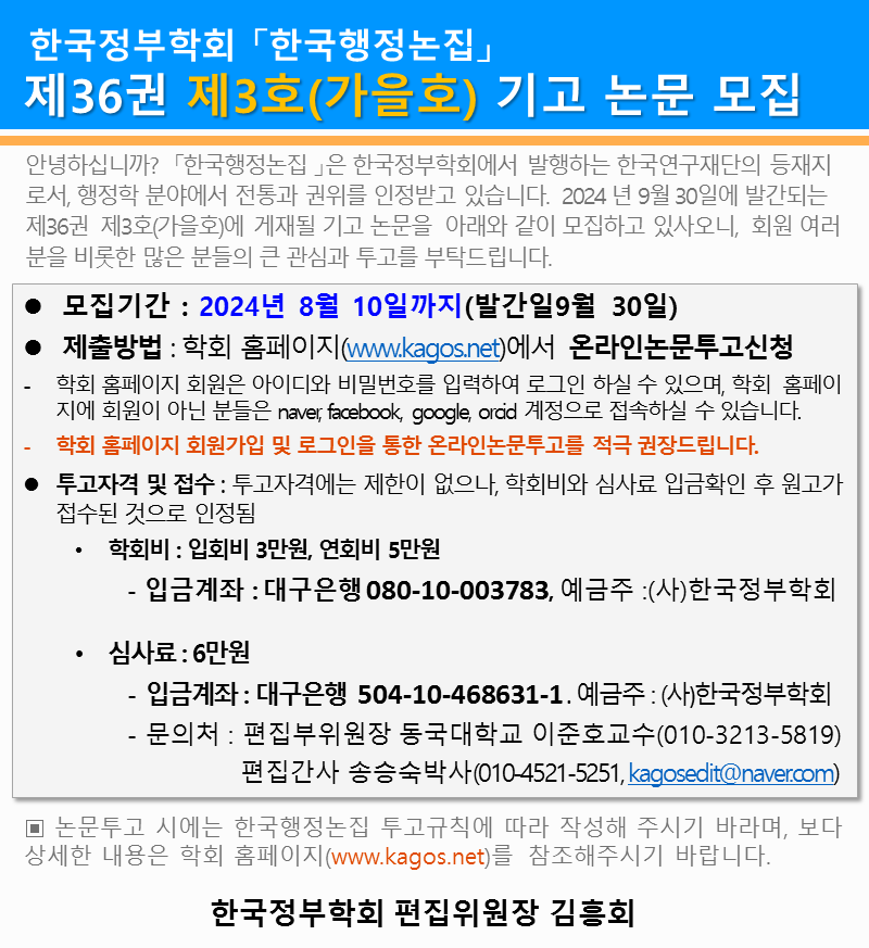 한국행정논집 제36권제3호(가을호) 논문 기고안내-기간연장