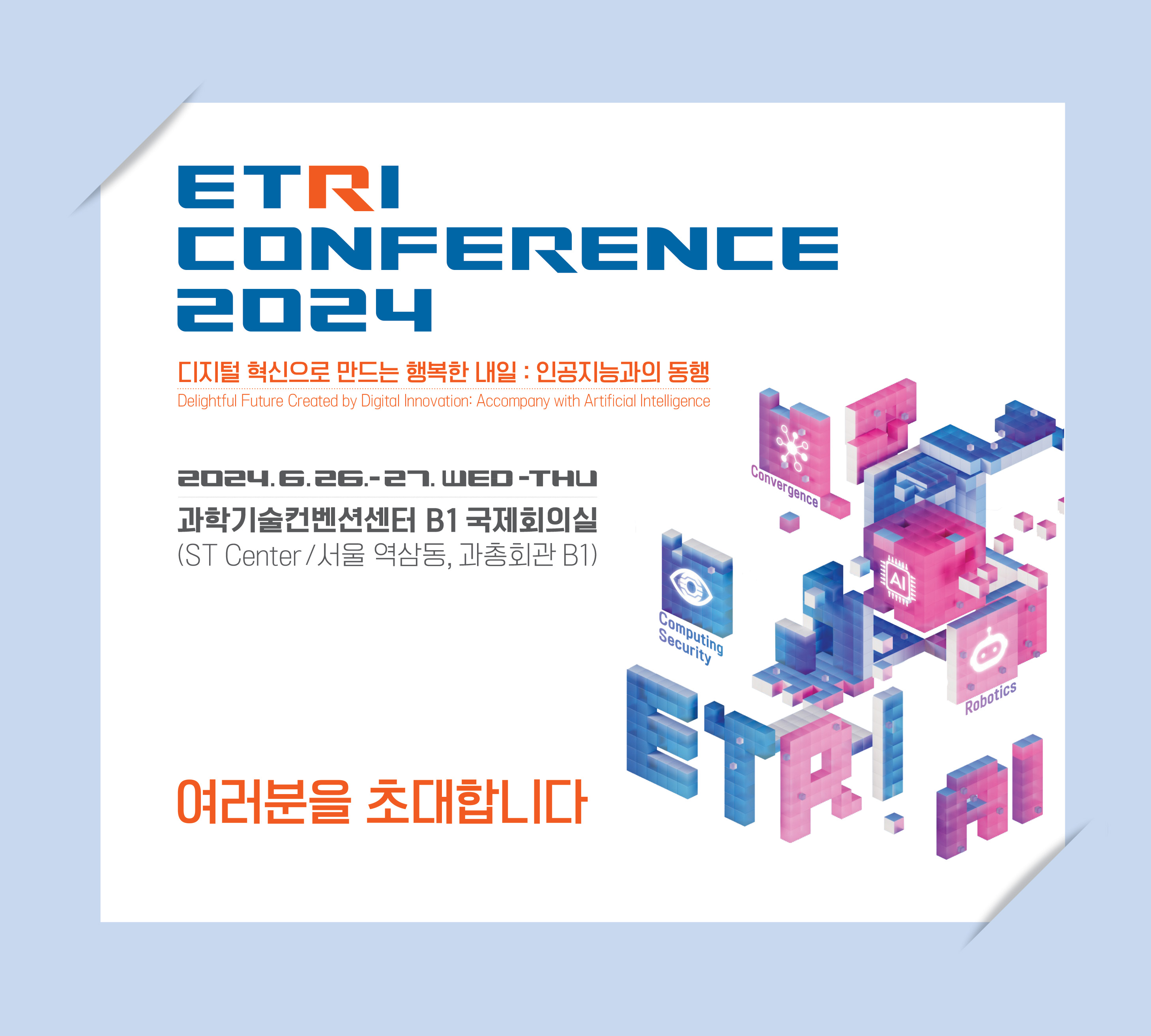 ETRI가 “디지털 혁신으로 만드는 행복한 내일: 인공지능과의 동행”을 주제로 ETRI Conference 2024를 개최합니다.