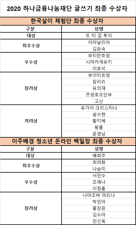 2020년 하나금융나눔재단 글쓰기 최종 수상자