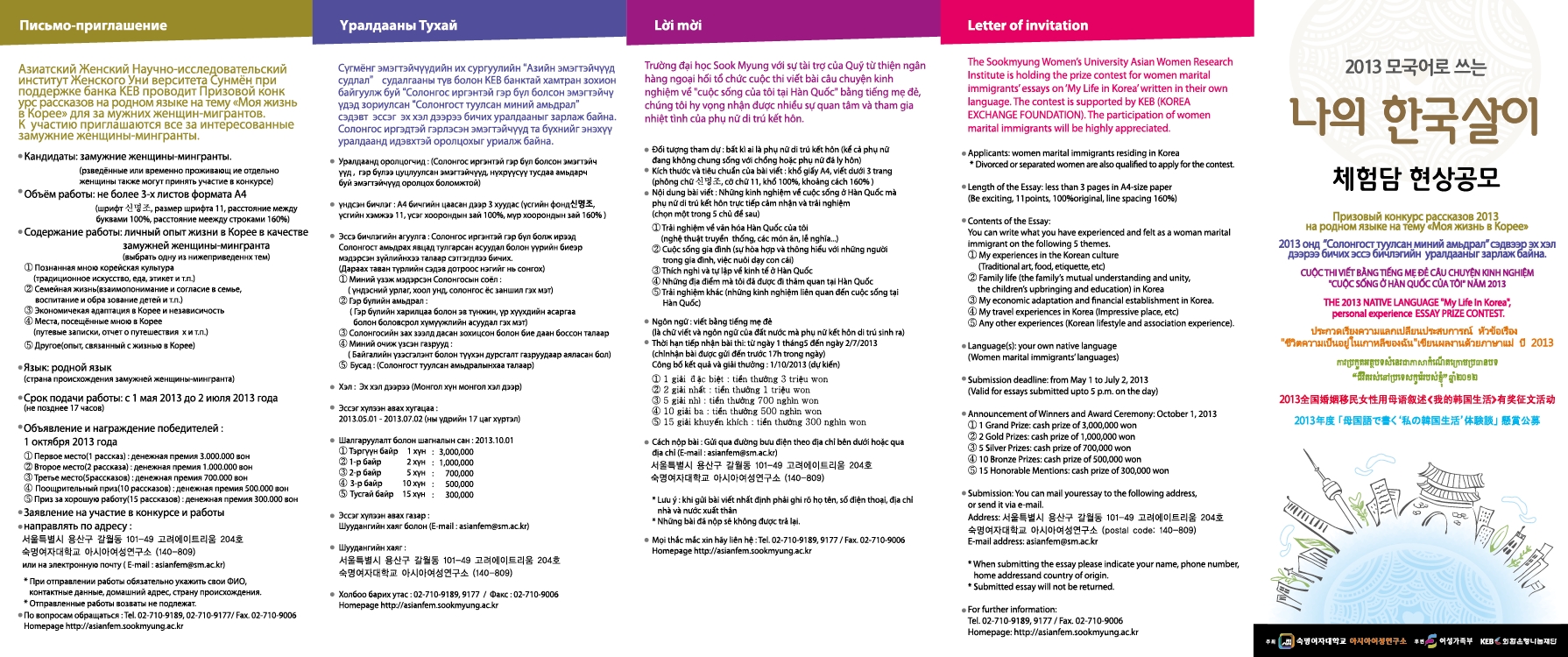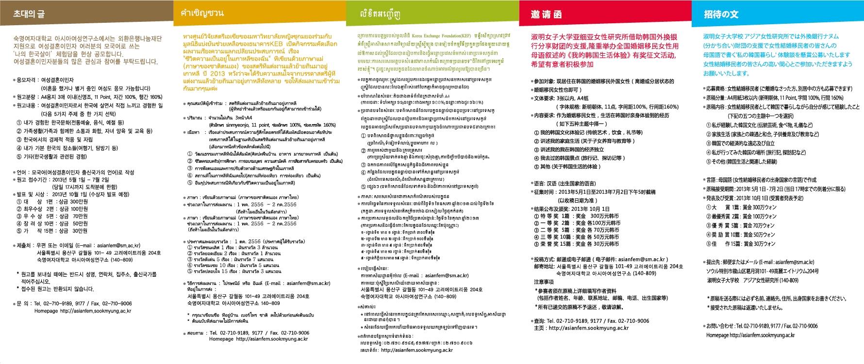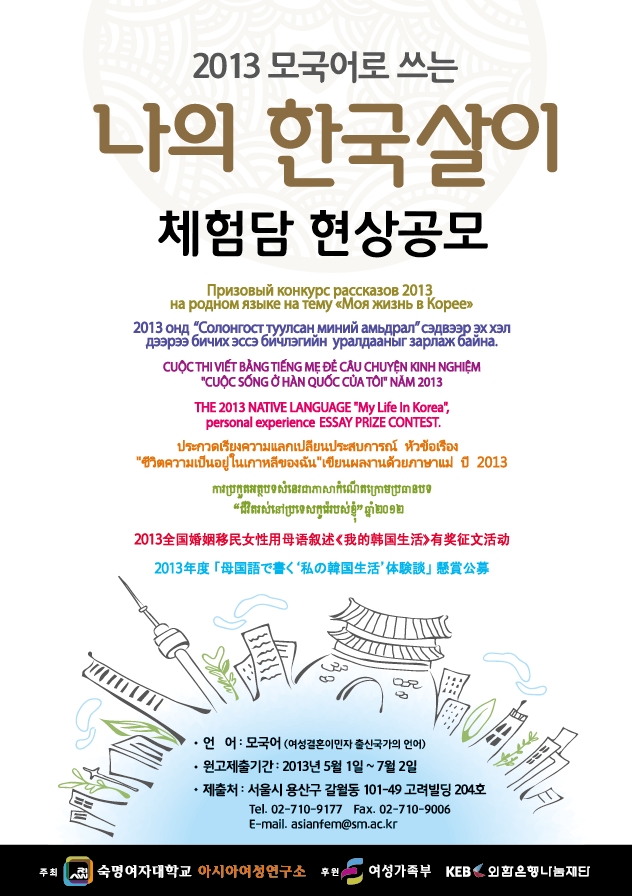 숙명여자대학교 아시아여성연구소에서는 외환은행나눔재단 지원으로 여성결혼이민자 여러분의 모국어로 쓰는 '나의 한국살이' 체험담을 현상 공모합니다여성결혼이민자분들의 많은 관심과 참여를 부탁드립니다.