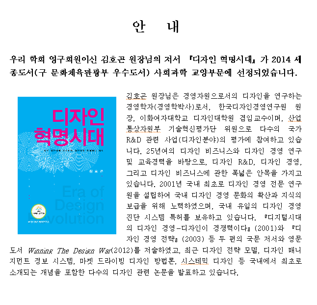 김호곤 원장 저서 『디자인 혁명시대』2014 세종도서 사회...