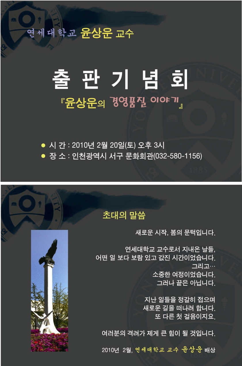 윤상운 교수님 출판기념회 안녕하세요. 한국품질경영학회 입니다. 연세대학교 윤상운교수님의 출판기념회를 인천광역시 서구 문화회관에서 개최를 하오니 관심있는 분들의 많은 참여를 바랍니다. -------------아 래-------------- 일 시: 2010년 2월 20일 (토) 오후 3시 장 소: 인천광역시 서구 문화회관 자세한 내용은 첨부한 홍보물을 참고하시기 바랍니다. 좋은하루 보내세요. 감사합니다.