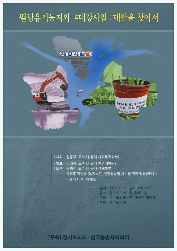 주제 : 팔당유기농지와 4대강 사업 : 대안을 찾아서 사회 : 김흥주 교수(원광대 사회복지학과) 발표 : 김정욱 교수(서울대 환경대학원) 토론 : 윤병선 교수(건국대 경제학부) 유영훈 위원장(농지보존, 친환경농업 사수를 위한 팔당공대위) 이훈석 대표(세미원) 일시 : 2010년 11월 26일(금) 10:00~12:00 장소 : 경기도의회 1층 대회의실 주최 : 경기도의회, 한국농촌사회학회 후원 : 경기도의회