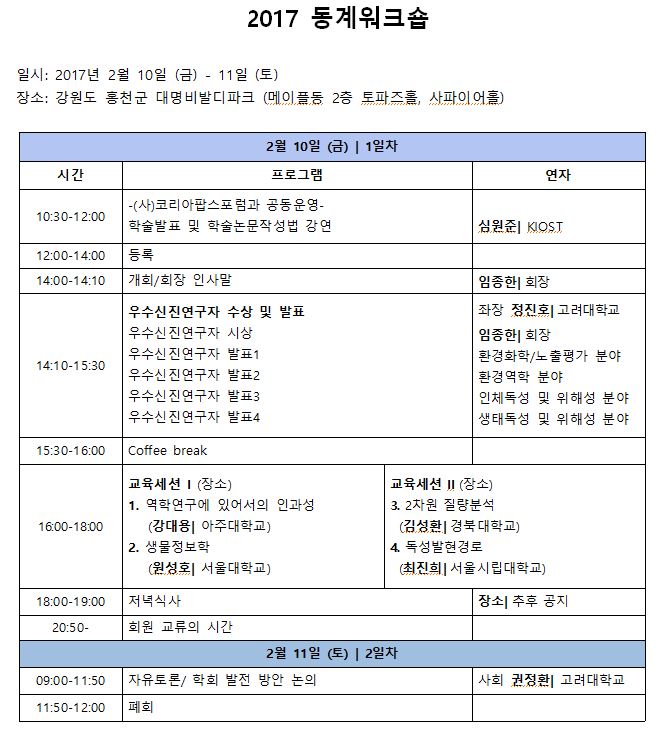 저희 환경독성보건학회의 2017년 첫 연례행사인 2017 동계워크숍을 안내합니다.