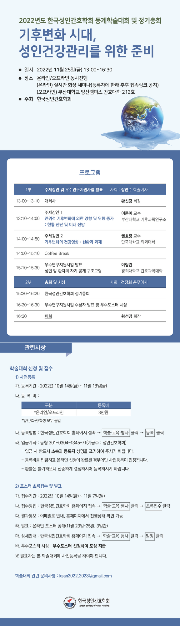 한국성인간호학회 2022년 동계학술대회 및 정기총회 개최 안내합니다. 학술대회에서는 포스터 발표 및 포상도 진행한다고 하니 관심있는 회원님들의 많은 참여 부탁드립니다.