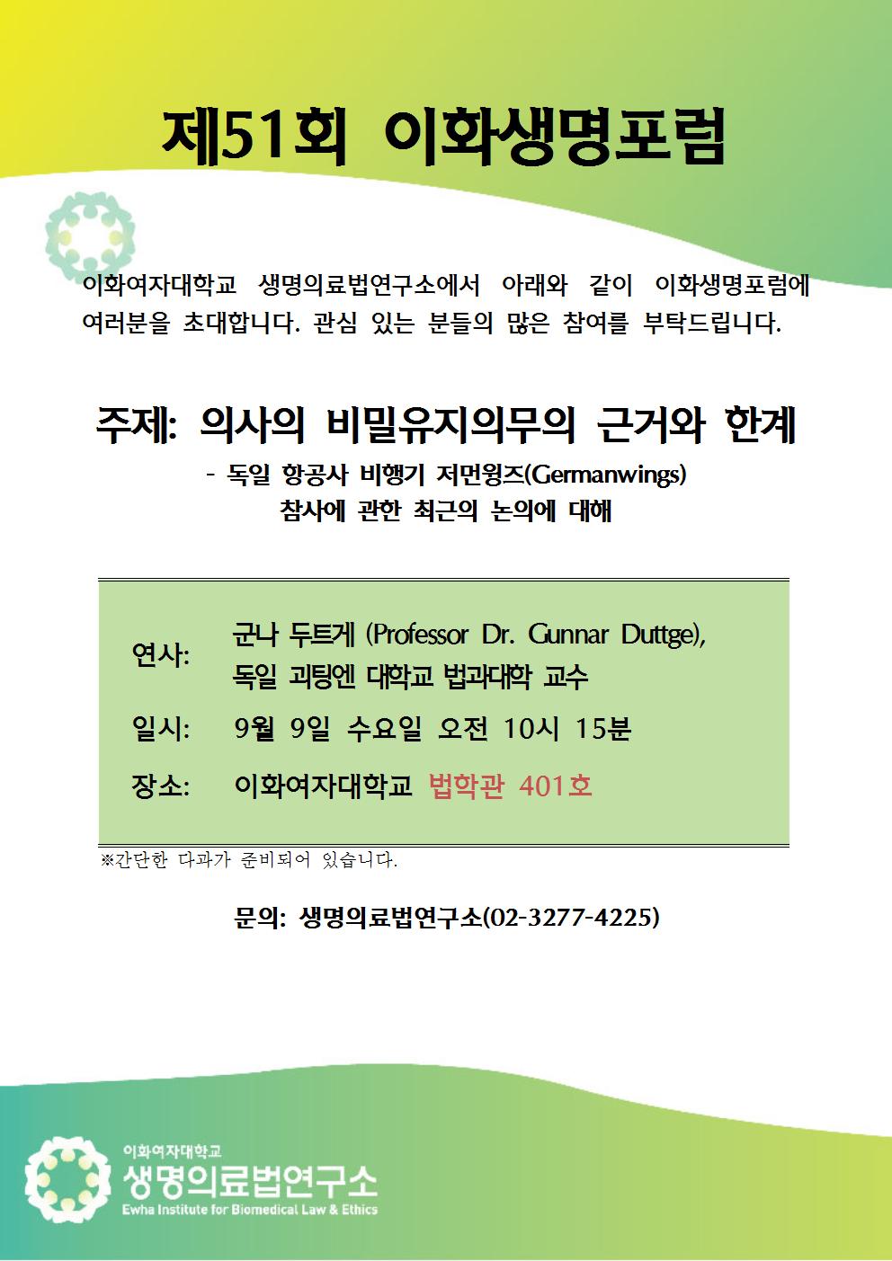 제51회 이화생명포럼 안내- 의사의 비밀유지의무의 근거와 한계