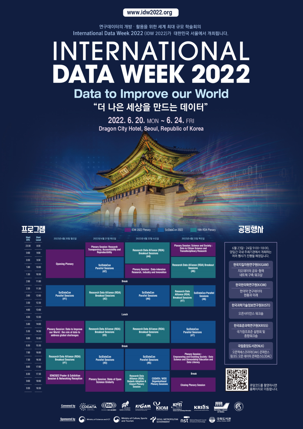 연구데이터 관련 최대 국제행사인 International Data Week 2022(IDW 2022)가 6월 20일부터 24일까지 서울드래곤시티(용산)에서 개최됩니다.