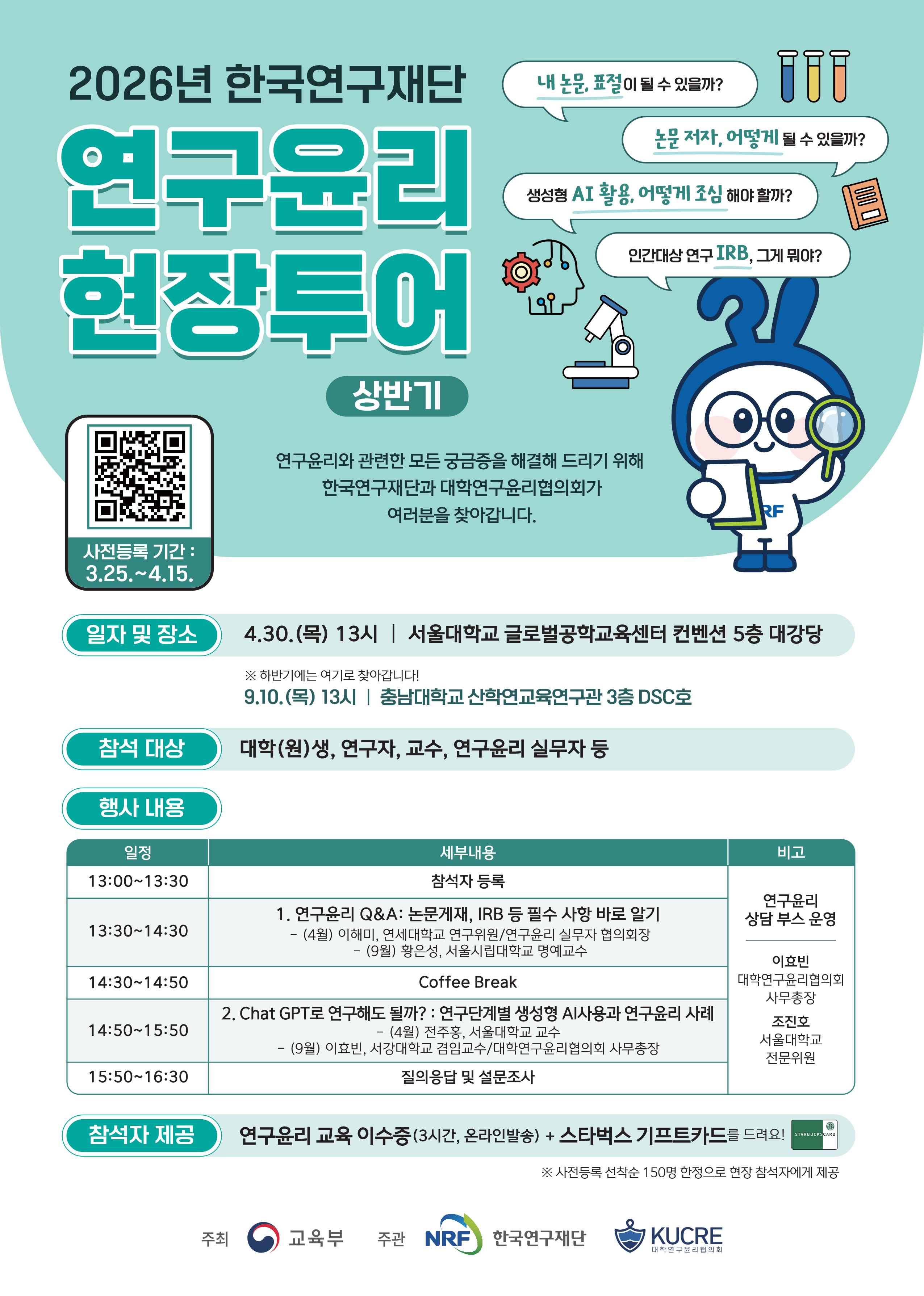 2. 국연구재단에서는 연구현장의 연구윤리 확립 및 제도개선 등을 위해 연구윤리 이슈에 한 교육 및 의견수렴을 위한‘2026년 연구윤리 현장 투어'를 아래와 같이 개최한다 하오니관심있는 분들의 많은 참여 바랍니다.