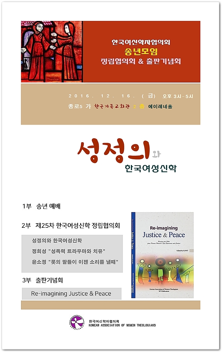 올해 여신협 12월 송년모임은 한국여성신학 정립협의회와 출판기념회를 겸하여 함께 진행합니다. 많이 오셔서 2016년 한해를 여성들의 기도와 토론, 나눔으로 마무리할 수 있기를 바랍니다.