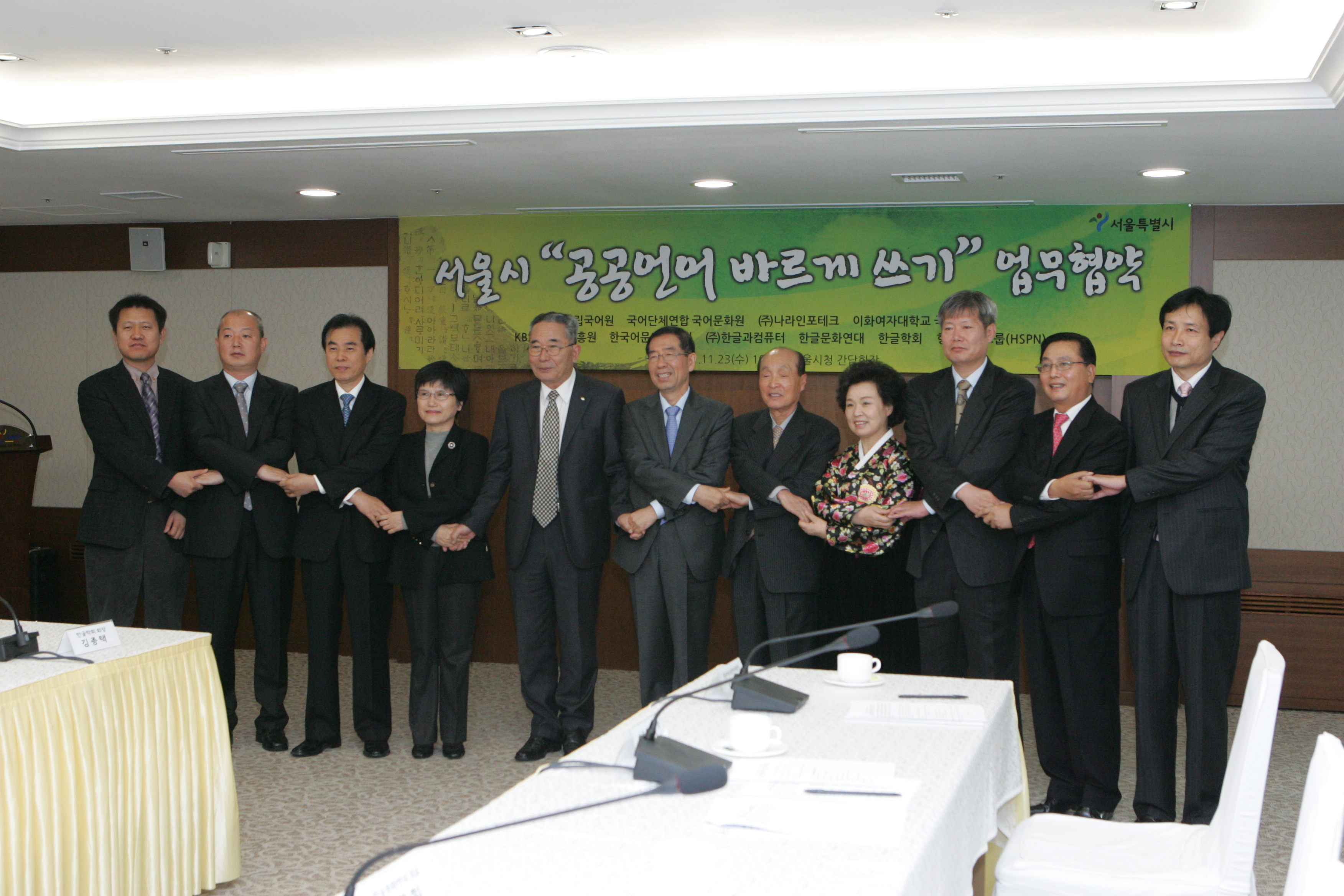 △ 아래 사진: 2011년 11월 23일 오전 10시 30분 서울시청에서 있은 '서울시 공공언어 바르게 쓰기' 업무 협약에 참석한 서울시 행정용어순화위원회 위원들의 모습.