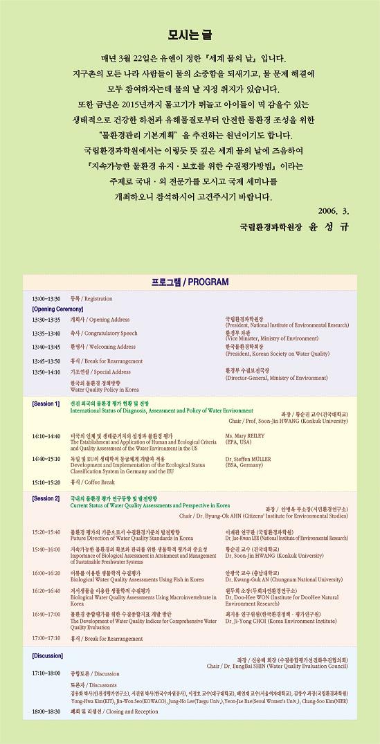 우리 과학원에서는 2006년 세계 물의 날을 기념하여 『지속가능한 물환경 유지.보호를 위한 수질평가방법』이라는 주제로 국내.외 전문가를 모시고 붙임과 같이 국제 세미나를 개최하오니 귀 학회의 홈페이지에 공지하여 회원님들이 많이 참석할 수 있도록 협조하여 주시기 바랍니다.